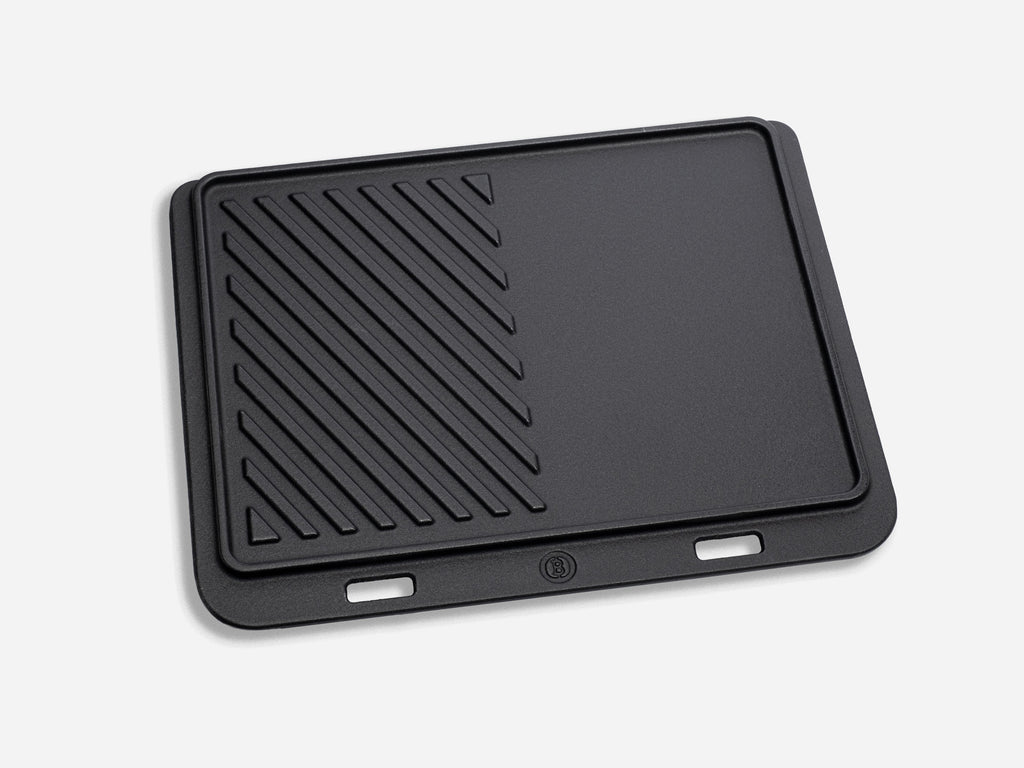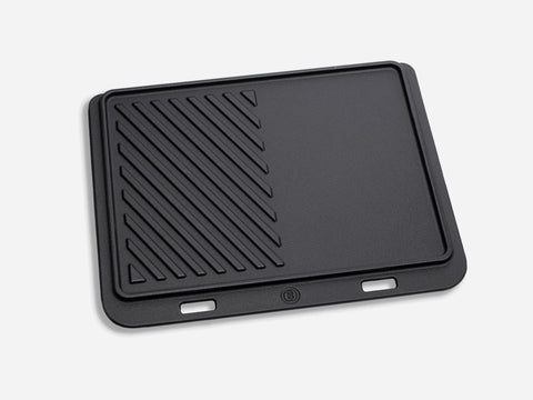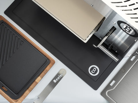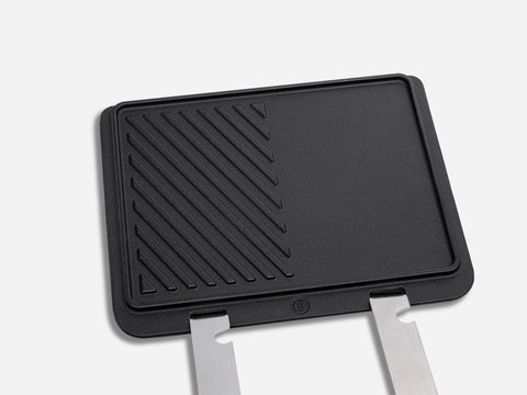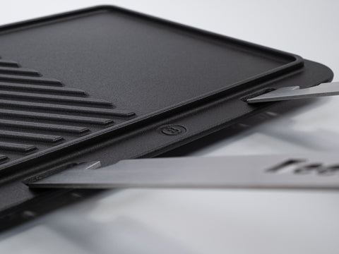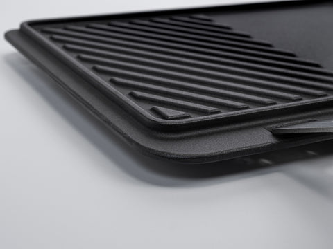 Die robuste Beefer Gusseisen Pfanne XL aus dem System 800 ist einseitig verwendbar in allen XL-Geräten. Eine Hälfte ist glatt und die andere Hälfte mit Grillmuster versehen, so dass gleichzeitig verschiedene Produkte gebeeft werden können. Der erhöhte Rand auf beiden Seiten fängt den Saft mühelos auf, den du wunderbar auch als Saucenbasis nutzen kannst. Die Röstaromen sind einfach einmalig für eine köstliche Sauce. Mit den beiden Beefer-Griffen aus dem System 800 lässt sich die Gusseisen Pfanne XL leicht aus dem Beefer ziehen. Die Reinigung erfolgt mit warmem Wasser und milder Seife.