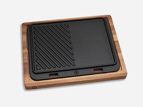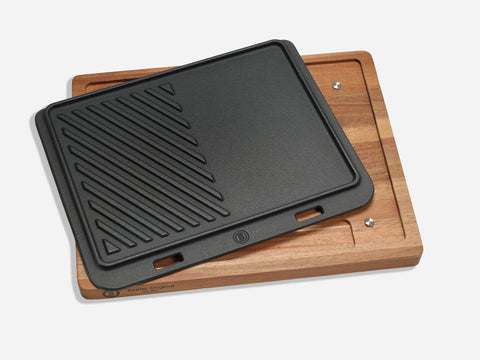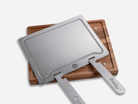 Das stabile Beefer Multifunktions-Schneidebrett XL ist eine äußerst praktische Ergänzung des Systems 800 und kann auch noch beidseitig benutzt werden – was könnte man mehr wollen? Die eine Seite bietet durch den erhöhten Rand sicheren Stand für das Beefer Pro Zubehör des Systems 800, z.B. die Plancha Platte XL und integrierte Abstandhalter aus Edelstahl sorgen gleichzeitig für einen Hitzeschutz des Holzes auf der anderen Seite. Die andere Seite verfügt über eine Fleischrille. Gefertigt aus bestem geöltem Akazienholz und rostfreiem Stahl. Reinigung geschieht am besten mit etwas lauwarmem Wasser und milden Seifen.